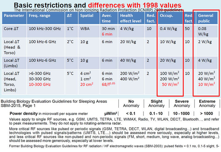 The BioInitiative, as well as the German Building Biology Guidelines for Sleeping areas research evidence has maximum limits of 10µW/mtr² to 30µW/mtr² (30 micro watts) compared to a million times more with ICNIRP at 20W/mtr².